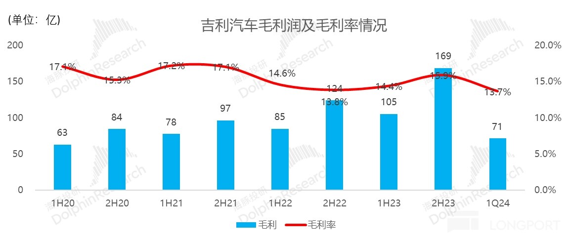 一季度毛利率仅 13.7%,环比 23 年下半年下行了约 2.3%,海豚君推测可能由于吉利新能源品牌的毛利下滑所致。一季度极氪毛利率仅 12%,相比 23 年下半年 15.2%下滑 3%,银河由于龙腾版降价,预计毛利率也呈现环比下滑趋势。