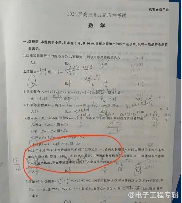 小米汽车SU7发布后,其相关信息也出现在《2024届高三5月适应性考试》的数学试卷上。
