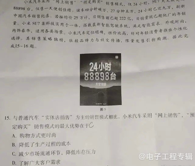 小米SU7开售,24小时就被预定了88898台,四分钟破万,27分钟破五万,刷新中国汽车销售记录等相关内容信息被作为题目背景来进行考题。