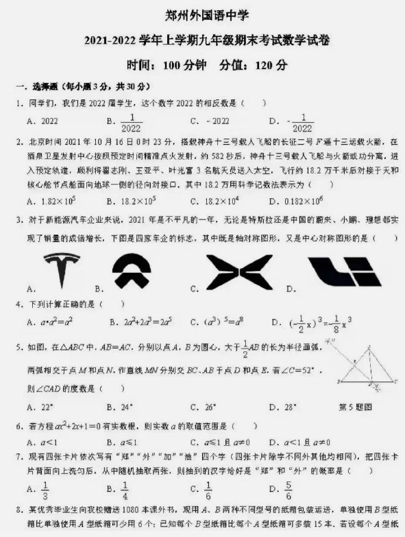 “郑州外国语中学”九年级期末数学考试卷中出现过“蔚小理”和特斯拉的身影。题目为“对于新能源汽车企业来说,2021年是不平凡的一年,