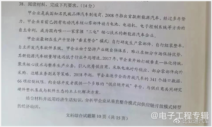 比亚迪在2021年以“甲企业”的身份惊现在全国乙卷文综第38题中。题目内容为,甲企业2008年推出首款新能源汽车,经过多年努力,该企业目前已拥有电动汽车核心零部件动力电池、电动机、电子控制系统等方面的自主专利,成为国内唯一一家掌握“三电”核心技术的新能源汽车企业……