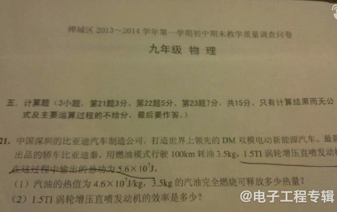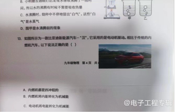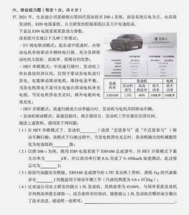 比亚迪多出现在物理试卷上,其中关于混动技术DM-i系统的相关试卷内容,问到该系统的几种工作模式,有EV纯电驱动模式、HEV串联模式、HEV并联模式,还以唐DM-i为例出题。