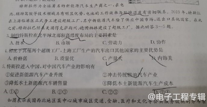包括特斯拉,也是在试卷上出现过。题中讲到特斯拉在电池、辅助驾驶等技术领域具有明显优势,2019年特斯拉在上海临港区正式开工建设超级工厂,也已经在美国德克萨斯州、德国柏林建设了超级工厂,问题中问到“制约特斯拉在北半球北部较高纬度布局的主要因素”“上海超级工厂生产汽车出口其他国家的优势”“特斯拉进入中国,对中国汽车产业的影响”。