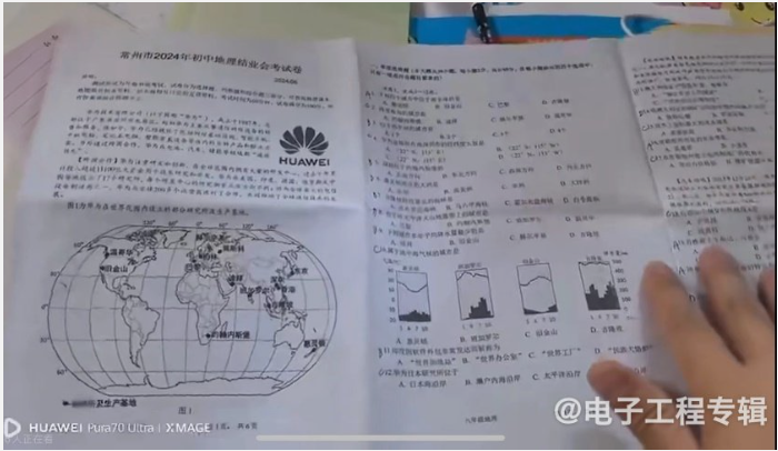有位自称是常州市初中生家长的网友发布视频称,在其初中二年级的儿子参加的《常州市2024年初中地理结业会考试卷》中出现了多个关于华为的题目,在试卷第一页印上了华为商标的明显标志,以及整页都有关于华为的大量题目。