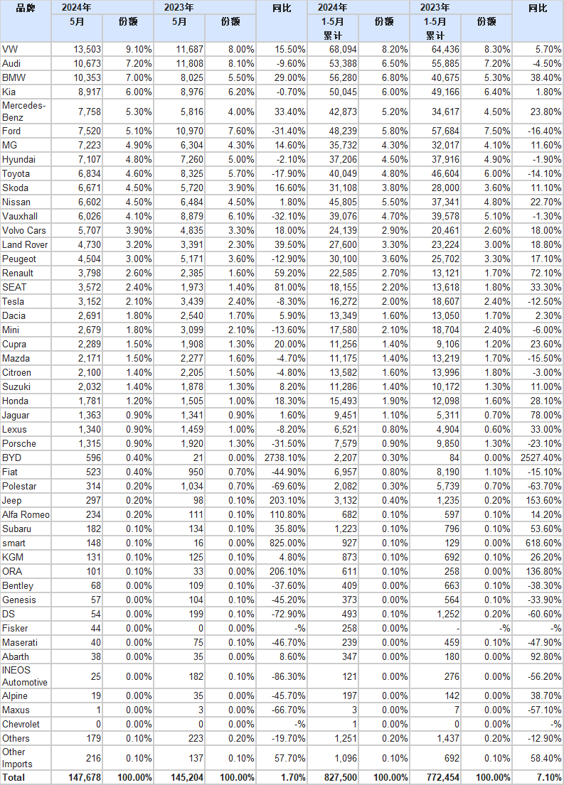 与此同时,另一中国品牌上汽MG继续其在英国市场的稳健步伐,5月注册量达到7223辆,同比增长15%。这一成绩不仅巩固了其市场地位,也彰显了中国品牌在全球舞台上的竞争力和适应能力。上汽MG的成功,基于其悠久的品牌历史与不断创新的产品线,它向世界展示了中国品牌如何在尊重传统的同时,拥抱未来,与国际知名品牌同场竞技并脱颖而出。