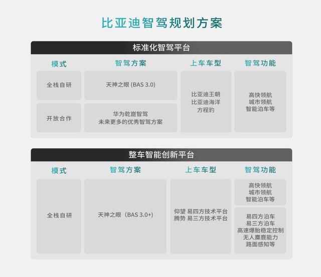 实际上比亚迪也公布了智驾规划方案,在和华为合作的同时,并没有放弃自研的天神之眼(BAS3.0)智驾方案,未来BAS3.0+还将融合易三方、易四方泊车,无人麋鹿,高速爆胎稳定控制等高阶功能。合作,或者采购供应商的解决方案必然不是智驾的终极形式,比亚迪只有自研才能融合自家的整车控制系统。比如说云辇系统在车里Z轴上的控制,易四方、易四方技术赋予车辆更高的极限,要和智能驾驶系统完全融合,可不是靠接口能搞定的。