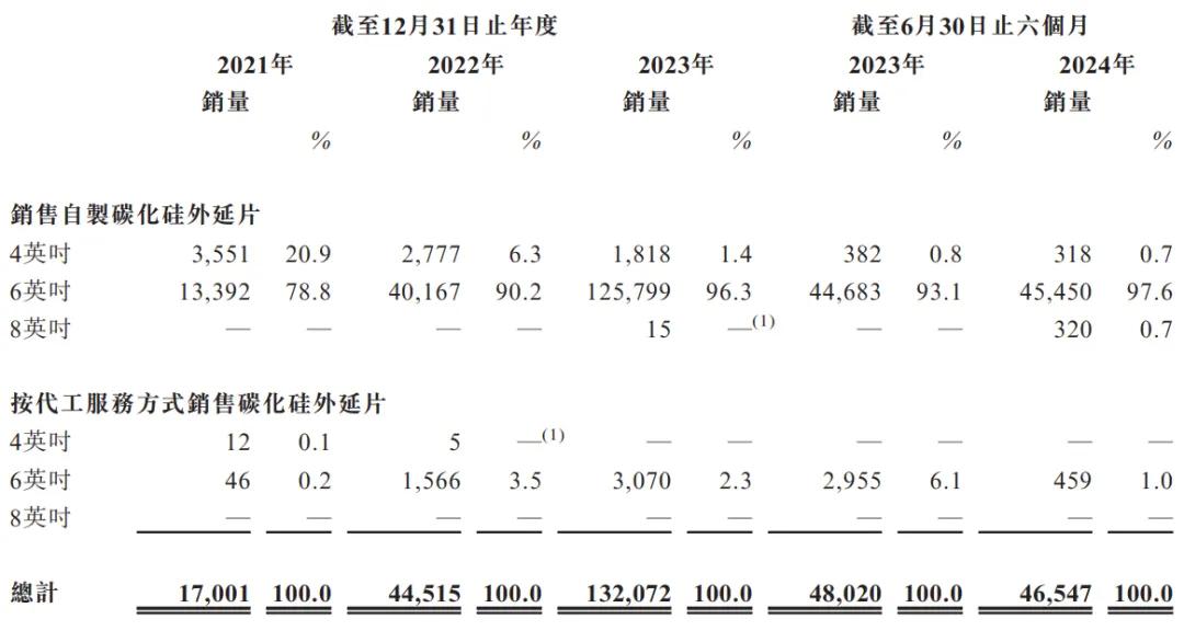 于2021年、2022年及2023年以及截至2023年及2024年6月30日止六个月,天域半导体分别销售17,001片、44,515片、132,072片、48,020片及46,547片碳化硅外延片。