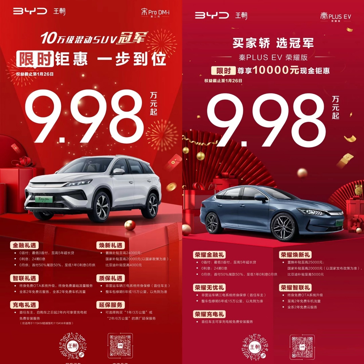 12月27日,“比亚迪汽车”官方微博发文称,即日起至2025年1月26日,对秦PLUS EV荣耀版和宋Pro DM-i进行限时优惠活动,优惠后两款车型起售价均为9.98万元。并且,这两款车还分别最高享受2.5万元和2.4万元的置换补贴。
