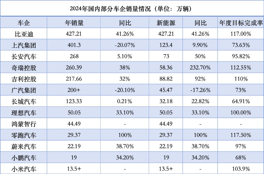 21世纪经济报道记者统计了包括传统车企(含孵化的新能源子品牌)与新势力在内的13家自主品牌2024全年的销量,超半数企业超额完成了年度销量目标。