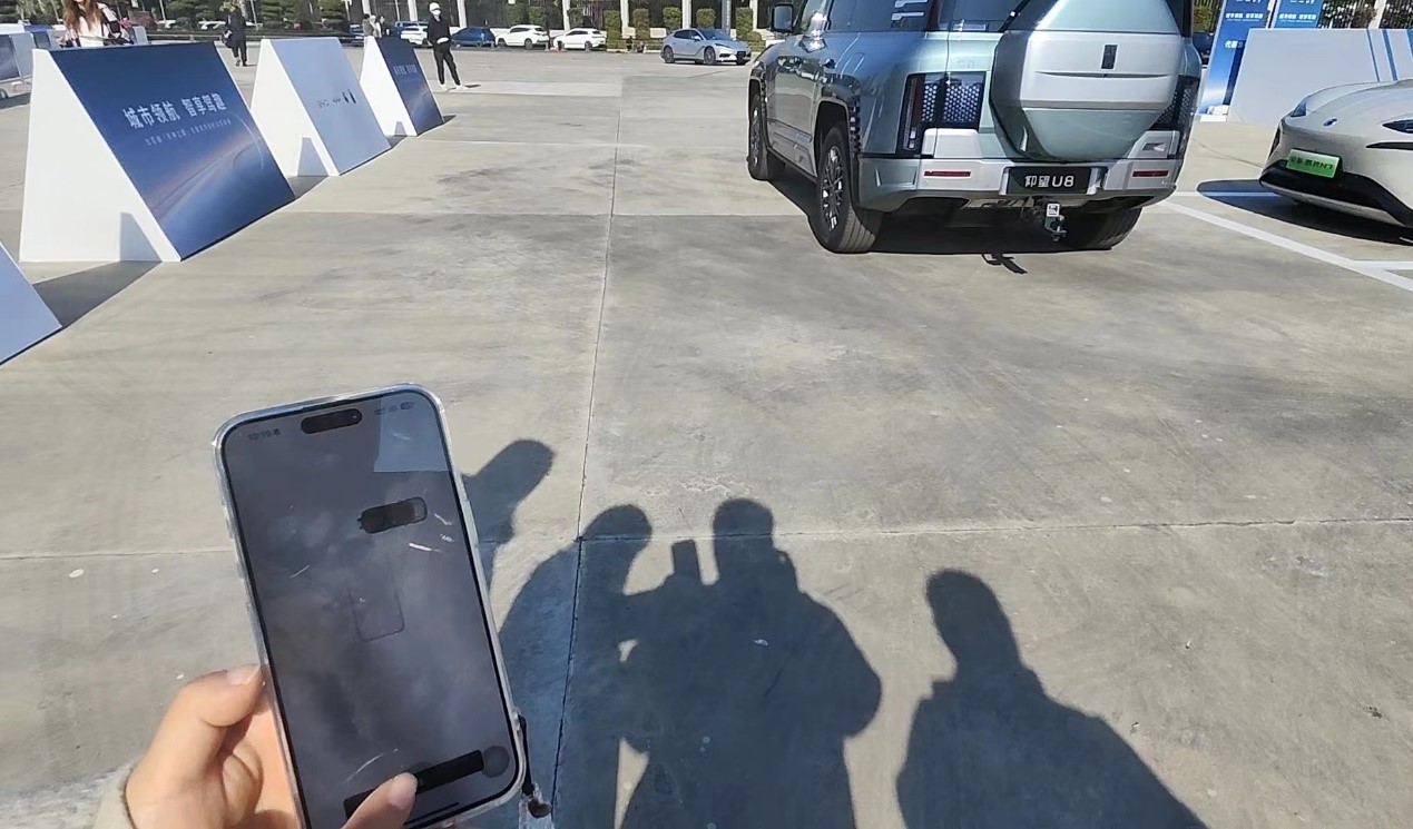 在体验中,仰望U8的窄车位遥控泊车令人印象深刻。当车辆识别到车位时,系统提醒用户踩刹车、点击屏幕上的代客泊车键,然后下车锁车即可。在左右单侧剩余30cm的狭窄垂直车位,和车头车尾单向距离障碍40cm的狭窄侧方车位,仰望U8都可以成功泊入。