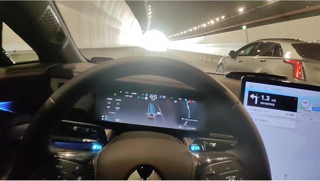 但在试驾过程中,也出现了两次小状况:第一次是在新修的道路,原本最左侧的直行道改成了左转道,车辆起初按导航走,但快到路口时,摄像头判断出为左转道路,随即车辆立刻压线并入中间车道。虽然出现这个小状况,但是由于导航未更新导致,且系统在识别路线变更后立马做出了执行调整,整体来说决策反映够快。