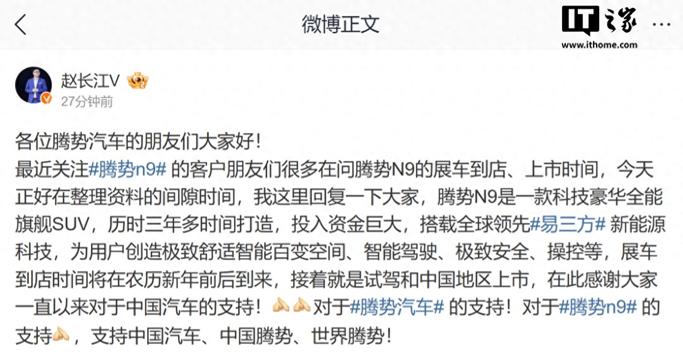 IT之家 1 月 5 日消息,比亚迪腾势销售事业部总经理赵长江今日透露,腾势 N9 的展车到店时间将在农历新年(IT之家注:春节为 1 月 29 日)前后到来,接着就是试驾和中国地区上市。