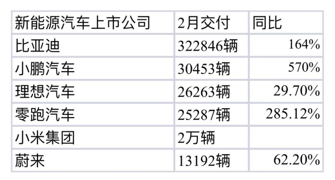 3月1日,中国主要新能源汽车企业发布2025年2月新车交付数据。蔚小理(蔚来、小鹏汽车、理想汽车)同比出现不同程度增长,比亚迪实现同比增长164%,东风旗下的岚图汽车、吉利旗下的极氪等也实现同比环比增加。