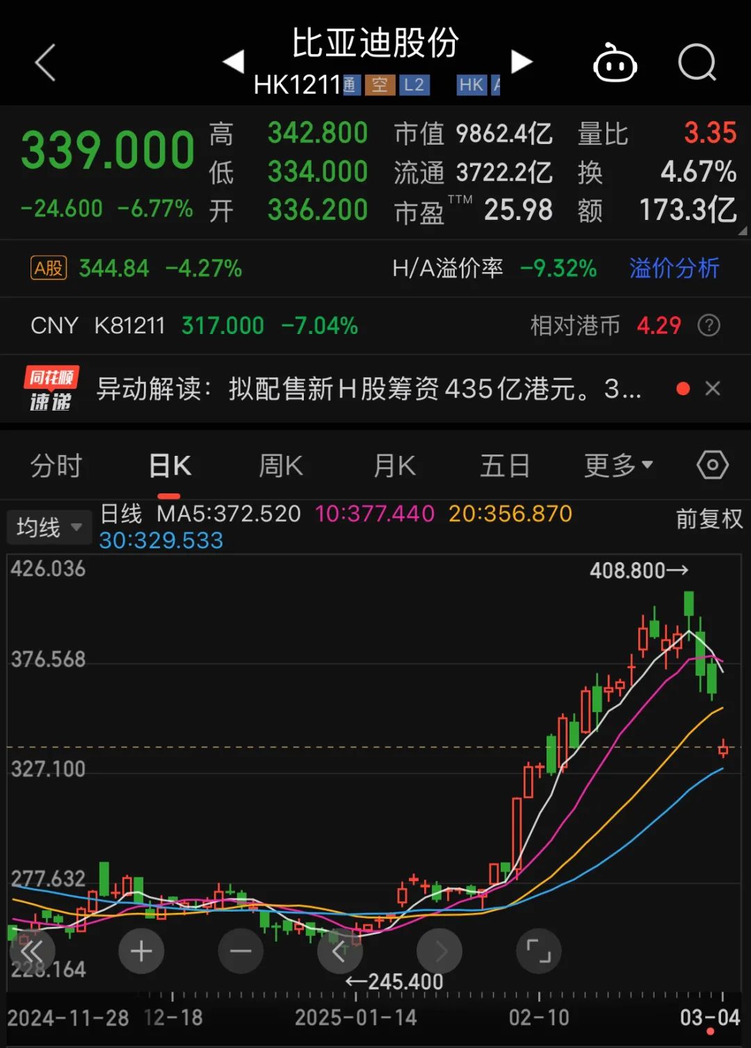 截至4日收盘,比亚迪股份跌6.77%,最新市值超9800亿港元。