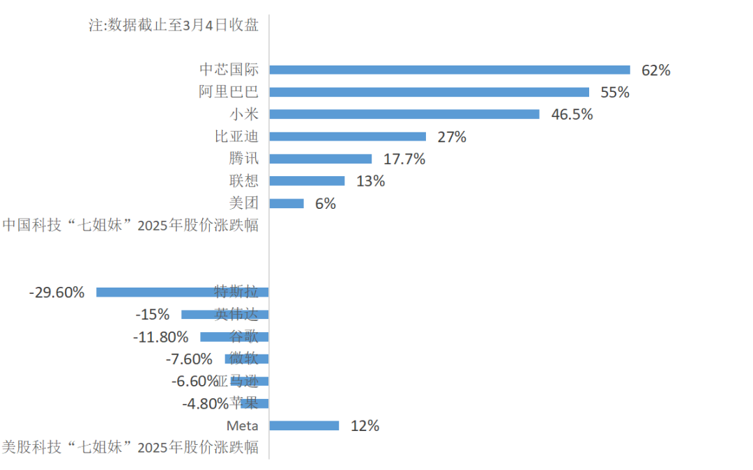 今年以来,中国科技七姐妹股价走势明显跑赢美国科技七姐妹。