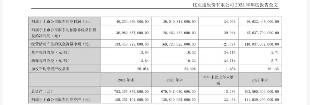 去年,比亚迪归属于上市公司股东的净利润为402.54亿元,同比增长34%;扣非后净利润为369.83亿元,同比增长29.94%。