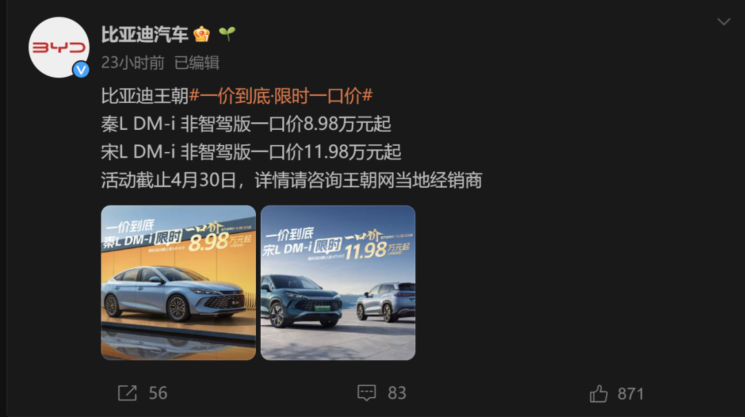 3月29日,比亚迪宣布,针对王朝部分车型非智驾版本推出限时一口价活动,秦L DM-i非智驾版一口价8.98万元起,宋L DM-i非智驾版一口价11.98万元起,活动截至4月30日。