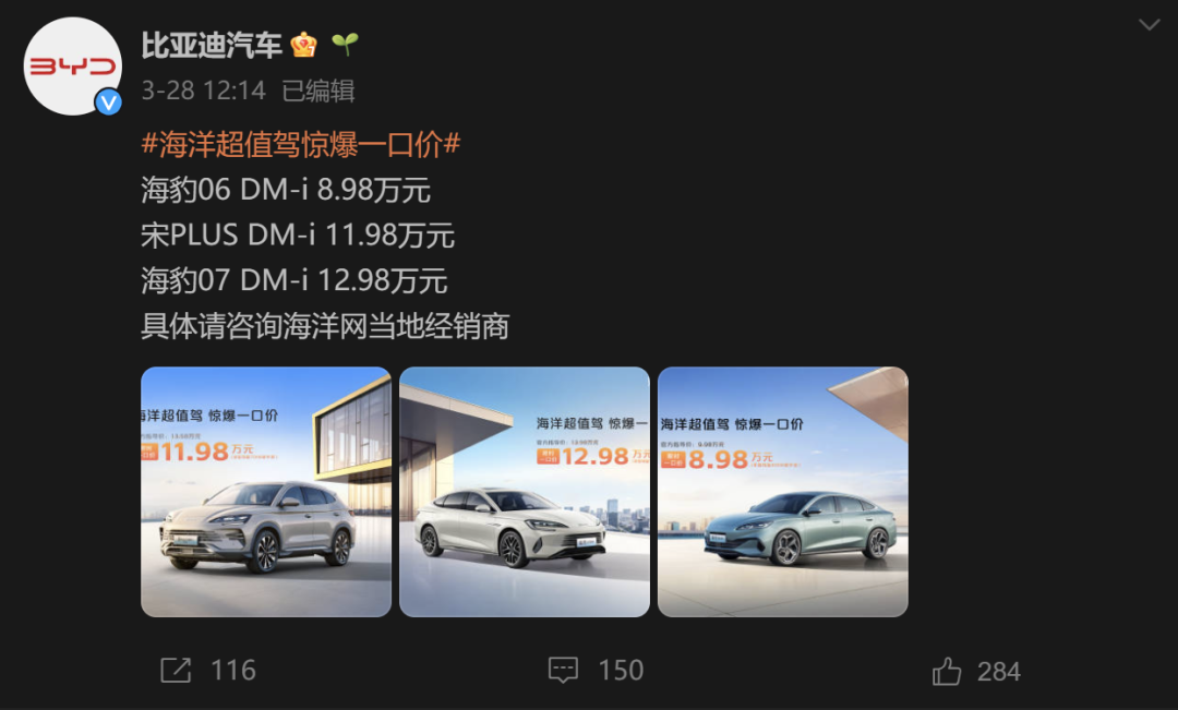 前一天,比亚迪已经官宣3款车型“劲爆一口价”:海豹06 DM-i 8.98万元,宋PLUS DM-i 11.98万元,海豹07 DM-i 12.98万元。