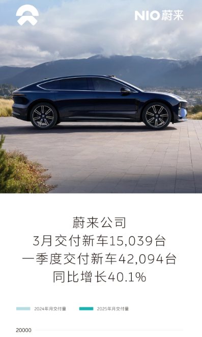 3月份,蔚来公司交付新车15039台,同比增长26.7%。其中,蔚来品牌交付新车10219台;乐道品牌交付新车4820台。2025年一季度,蔚来公司共交付新车42094台,同比增长40.1%。其中,蔚来品牌交付新车27313台,乐道品牌交付新车14781台。据悉,4月,蔚来第三品牌firefly萤火虫首款车型将上市。