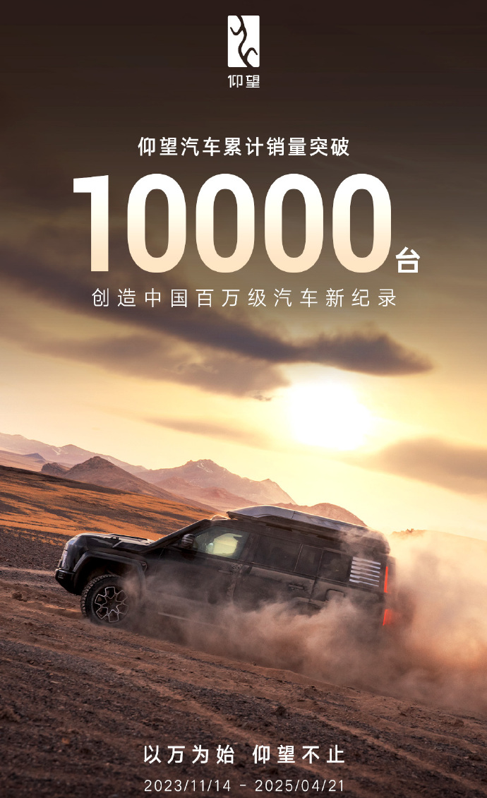 电动知家消息,4月21日,比亚迪旗下高端品牌仰望汽车宣布,其累计销量正式突破10000台,创造中国百万级汽车新纪录。