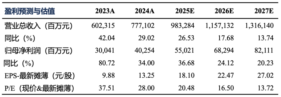 我们维持公司25-27年归母净利550/683/821亿元的预期,同增37%/24%/20%,对应PE 20/17/14x,给予25年28x,目标价507元,维持“买入”评级。