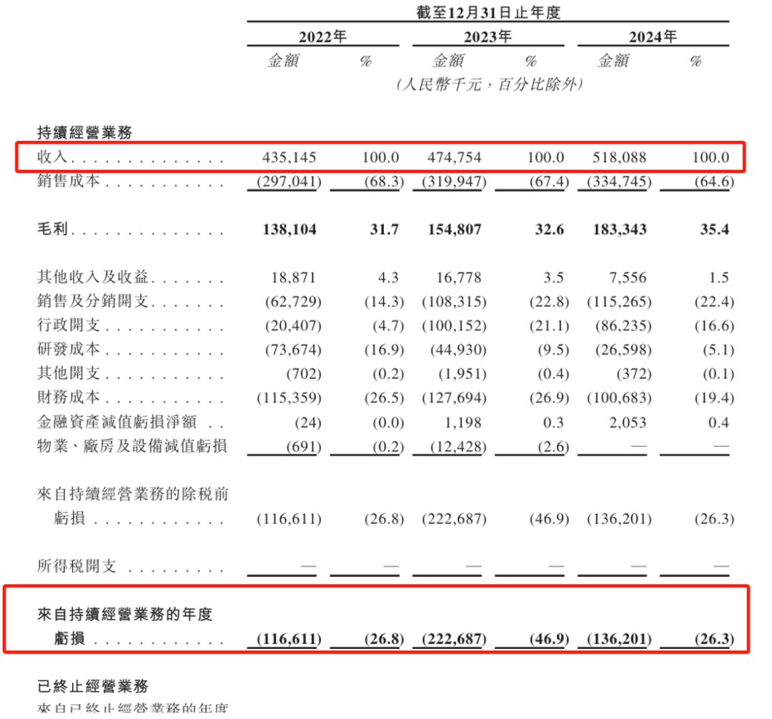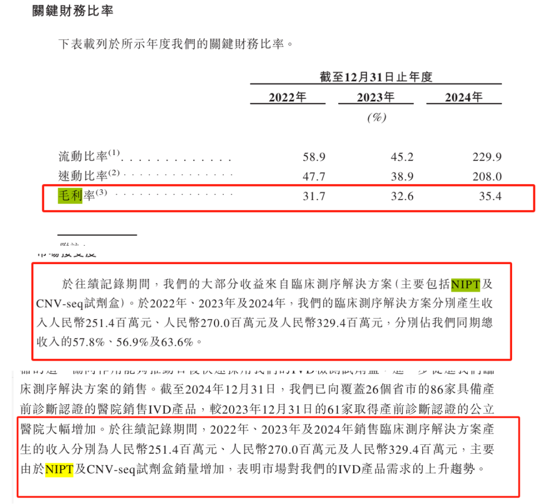 业绩方面,招股书显示,2022年—2024年,安诺优达的收入分别为4.35亿元、4.75亿元和5.18亿元。其中,临床测序解决方案产生的收入分别为2.51亿元、2.7亿元及3.29亿元,分别占总收入的57.8%、56.9%及63.6%;来自持续经营业务年度净亏损分别为1.17亿元、2.23亿元、1.36亿元;毛利率分别为31.7%、32.6%、35.4%。