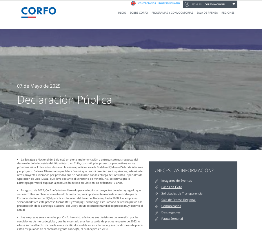 当地时间5月7日,智利生产促进局(Corfo)发布公告称,比亚迪与青山集团已分别放弃在智利安托法加斯塔地区投资建设锂电材料工厂的计划。