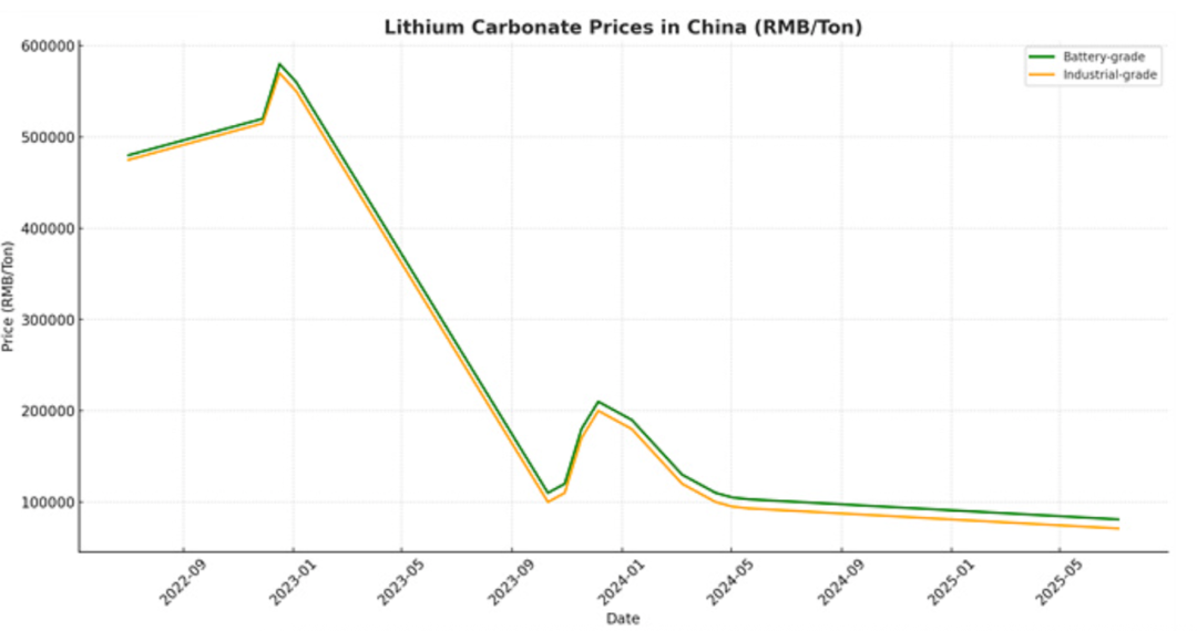 但随着供给端放量和需求阶段性放缓,锂价迅速回落。进入2025年,锂价已跌至每吨不足1万美元,市场环境发生根本性变化。