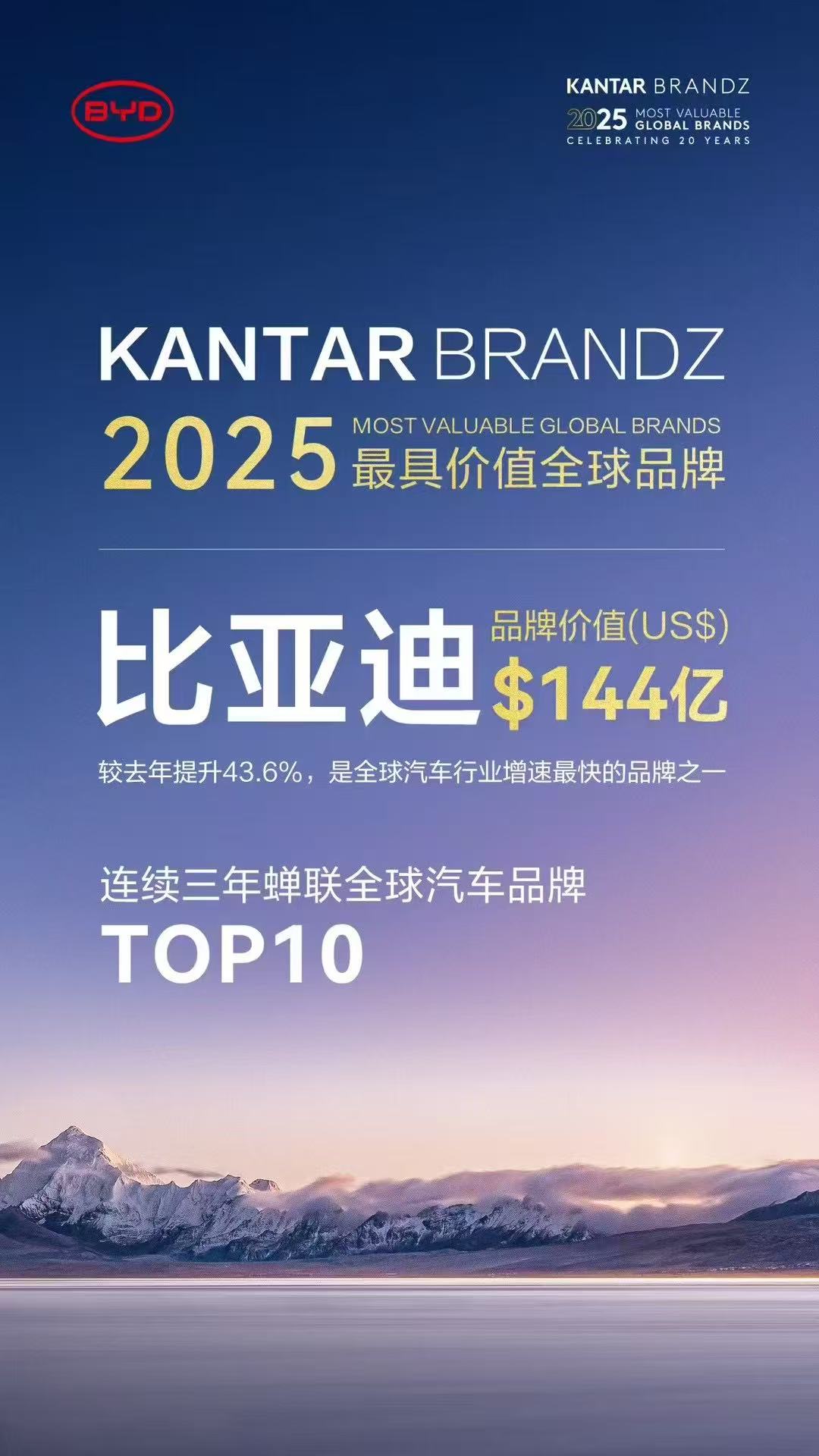 在凯度BrandZ最新发布的《2025年最具价值全球品牌》榜单中,比亚迪以144亿美元的品牌价值连续第三年跻身全球汽车品牌TOP10。榜单数据显示,比亚迪品牌价值较去年增长43.6%,成为全球汽车行业增速最快的品牌之一。这一成绩凸显了其在全球新能源市场的持续突破和品牌影响力的显著提升。