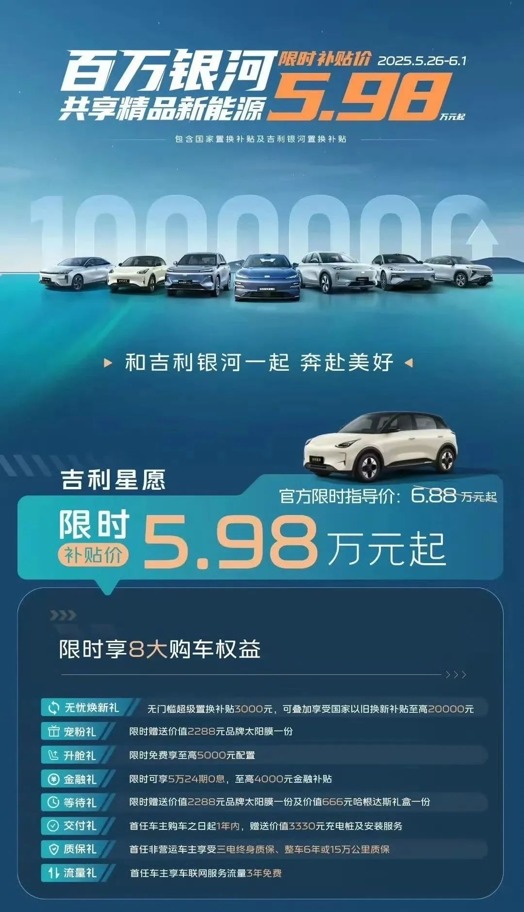 实际上,就在比亚迪降价的第二天5月26日,吉利银河就宣布推出全系限时购车补贴政策(除熊猫系列外),覆盖星愿、星舰7 EM-i、E5等多款热门车型,补贴幅度从5000元至2万元不等,活动持续至6月1日。此次优惠叠加国家以旧换新政策,部分车型“白菜价”甚至低于10万元,堪称年内最狠促销。