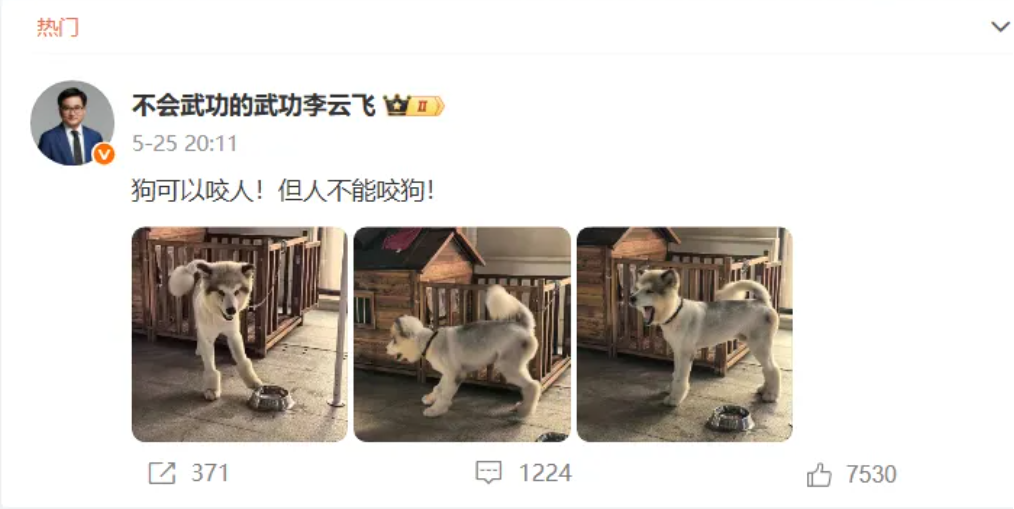 随后,李云飞连发多条动态,似乎在回应长城汽车董事长魏建军近日言论,其中有配文狗可以咬人,人不能咬狗;鬼吹灯等。