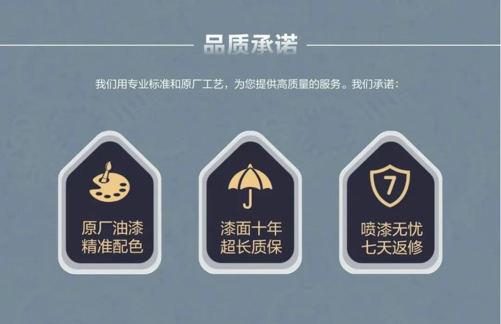 比如和漆猫一样展示自身的16道标准施工流程(内含33道工序),或者推出含钣金打包价的钣喷快修业务等,体现自身差异化;过程中可通过施工流程可视化,或提供‘3年不掉漆’‘10年质保’等承诺,强化专业形象。