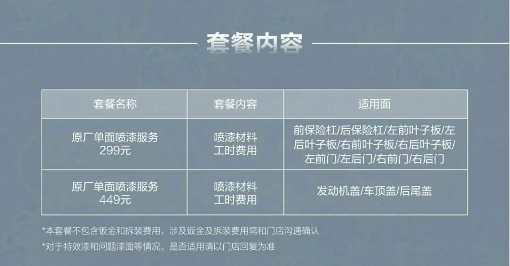 套餐包含喷漆材料和工时费,但不包含钣金和拆装费用。此外,该套餐服务很大概率也不适用于“特效漆和问题漆面”等情况,具体由4S店灵活判断。