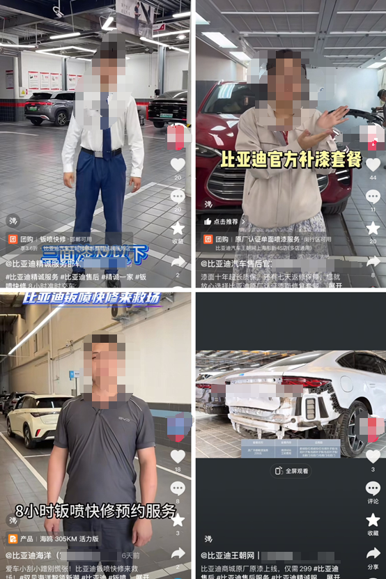 而在这次“299套餐”引发业内关注后,比亚迪旗下4S店迅速在抖音上展开大规模推广,除299元套餐外,重点宣传的是比亚迪"8小时钣喷快修(3面漆及以下)"服务,较年初的"3面漆次日取车"效率显著提升,同时保持"7天无理由返修、10年漆面质保"的承诺。
