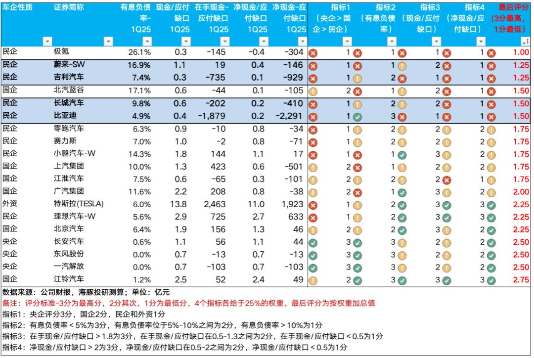 同时踩中这三类情况的车企,可能会是极端负面情形下再融资风险最大的玩家,海豚君通过罗列的4个指标进行评分(见下图:4个指标各给于25%的权重,最后评分按权重加总值从低到高排序),风险最高的车企是:蔚来汽车,吉利汽车,长城汽车,比亚迪。