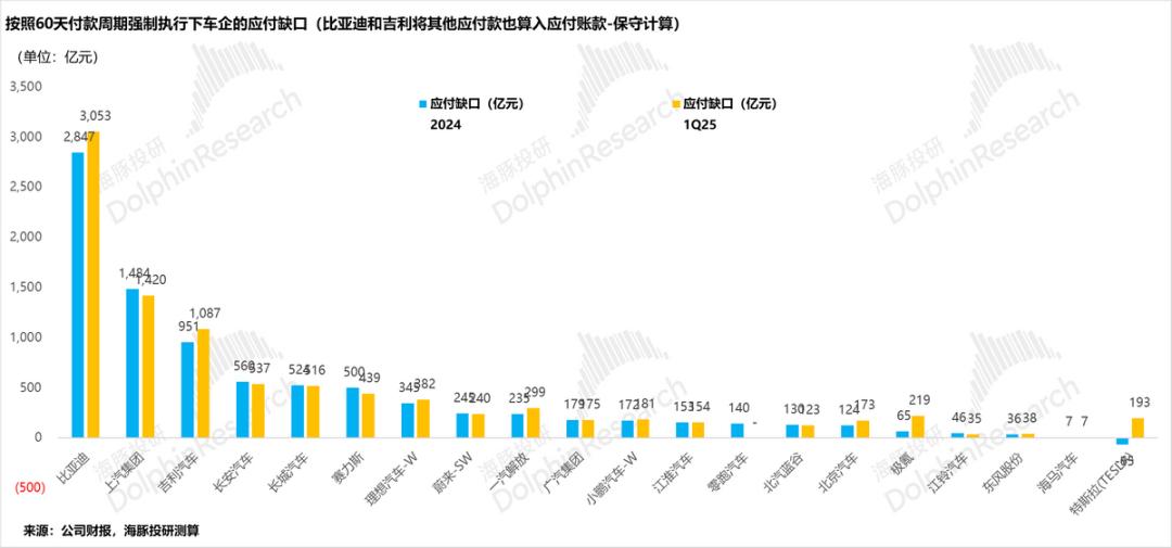 这样,海豚君把各家公司2024年和25年一季度的应付账款周转天数改为统一的60天,可以算出: