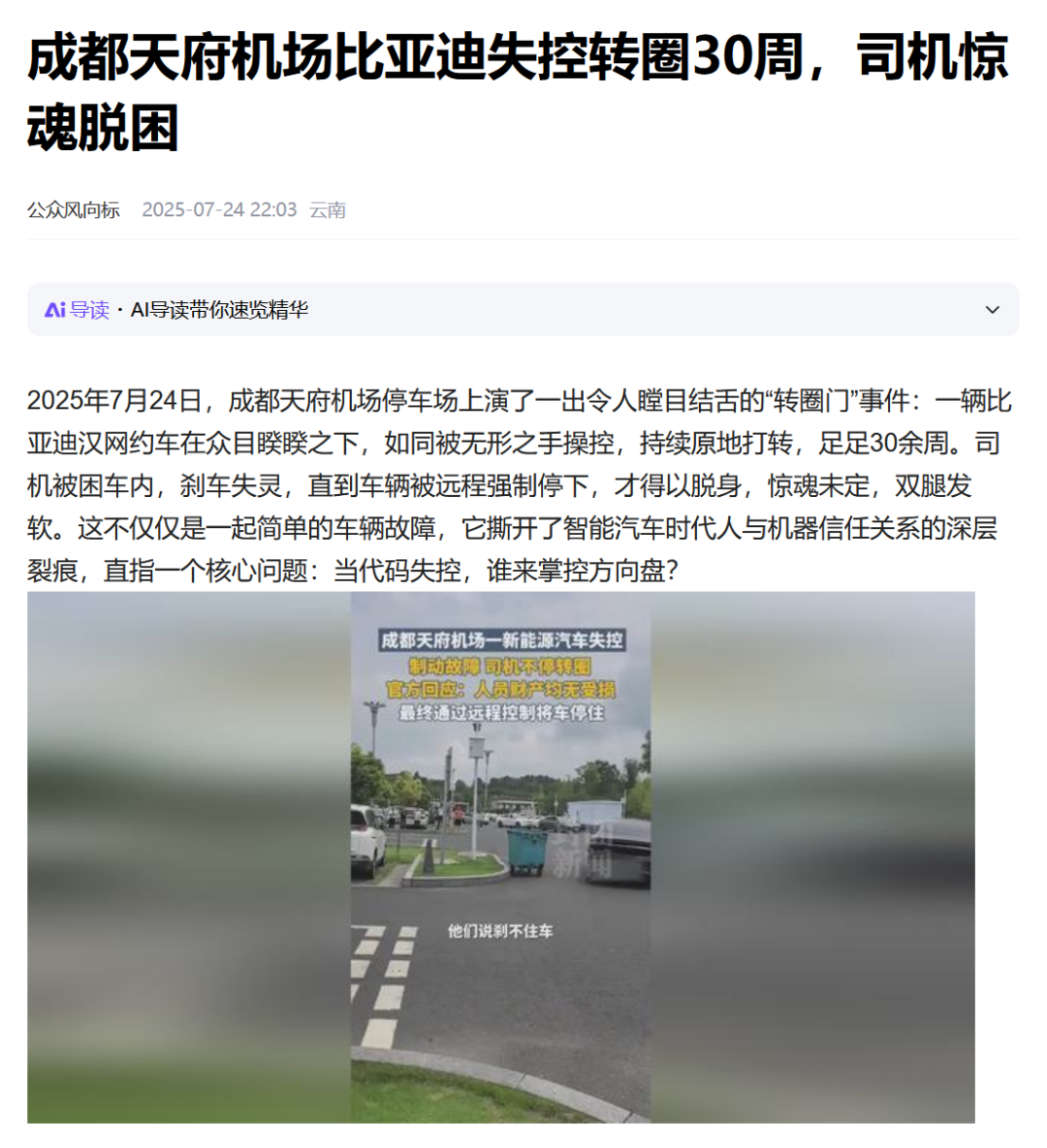 今天上午,相关部门对昨天引发热议的比亚迪“汉”失控事件发布了官方通报,表示车辆行驶异常完全是驾驶员本人的问题,是因为长时间没有联系到乘客,导致情绪急躁,开车在停车场内绕行,所谓的“比亚迪失控”完全是子虚乌有。