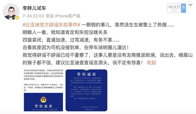 当天晚上,当地警方发布消息,称没有出现车辆失控的情况,是一位网约车司机在机场接不到客单,心情比较郁闷,所以就开车在机场溜达,也就是大家在视频中看到的“转圈圈”,最终警方到场之后,是司机自行将车辆靠边停下的,所以压根没有比亚迪后台“刹停”一说。但是视频的传播者,却言辞凿凿说比亚迪汉失控,且厂家后台介入停车了。