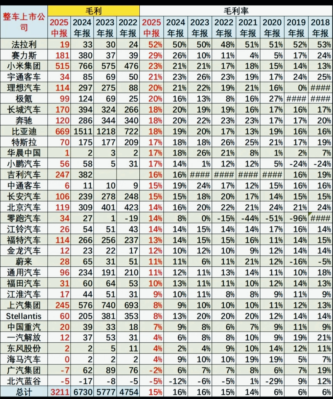 毛利率是衡量企业盈利能力的关键指标,2025年上半年,多家车企的毛利率呈现下滑态势。