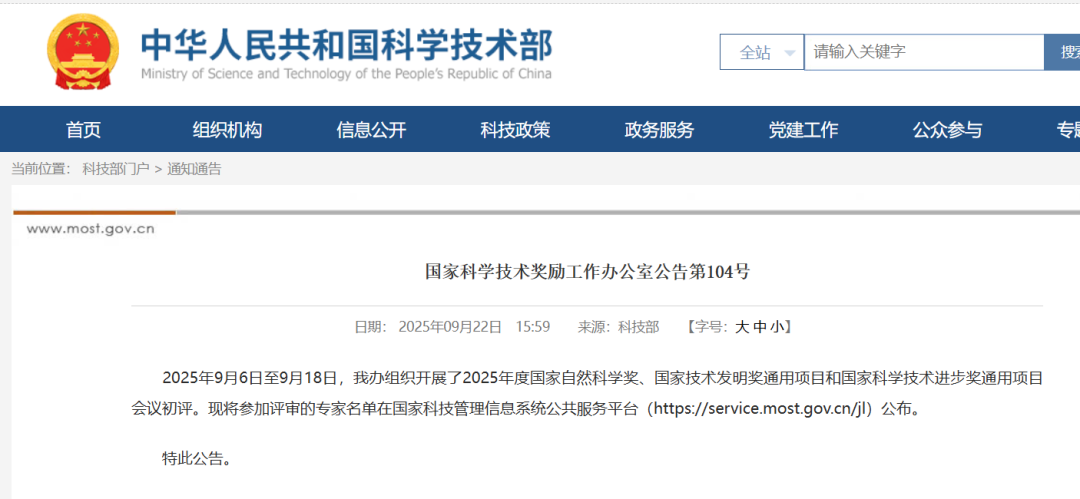 获悉,9月22日,中华人民共和国科学技术部官网发布公告,2025年度国家科学技术奖初评工作结束,共有60项国家自然科学奖项目、51项国家技术发明奖通用项目、134项国家科学技术进步奖通用项目通过初评。