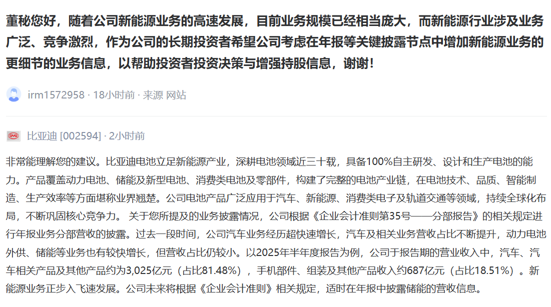 比亚迪17日在互动平台回答投资者提问时表示,过去一段时间,公司汽车业务经历超快速增长,汽车及相关业务营收占比不断提升,动力电池外供、储能等业务也有较快增长,但营收占比仍较小。以2025年半年度报告为例,公司于报告期的营业收入中,汽车、汽车相关产品及其他产品约为3,025亿元(占比81.48%),手机部件、组装及其他产品收入约687亿元(占比18.51%)。新能源业务正步入飞速发展。公司未来将根据《企业会计准则》相关规定,适时在年报中披露储能的营收信息。