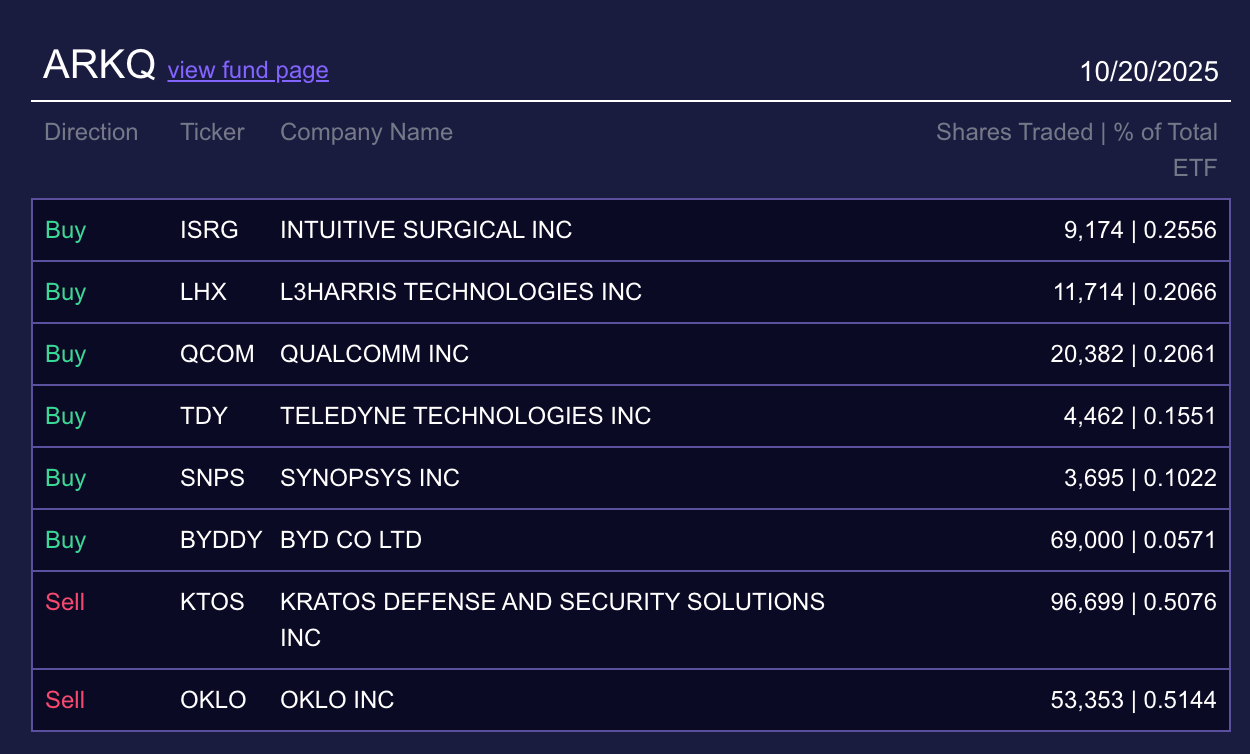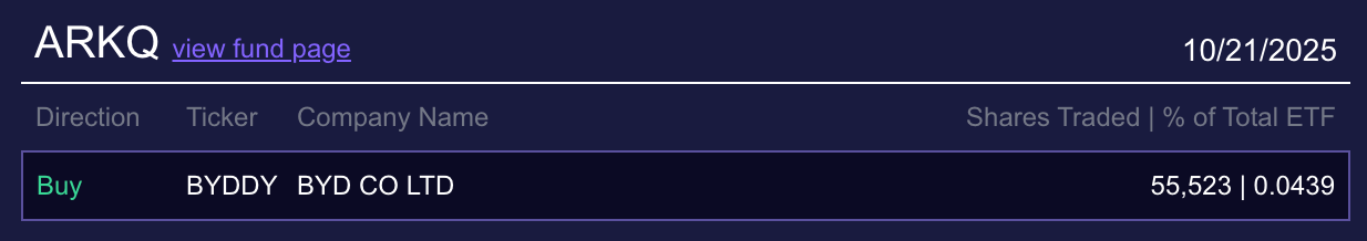 上述操作延续了ARK投资中国电动车制造商的模式。就在前一天(10月20日),ARK刚通过旗下ARKQ基金买入69000份比亚迪ADR。