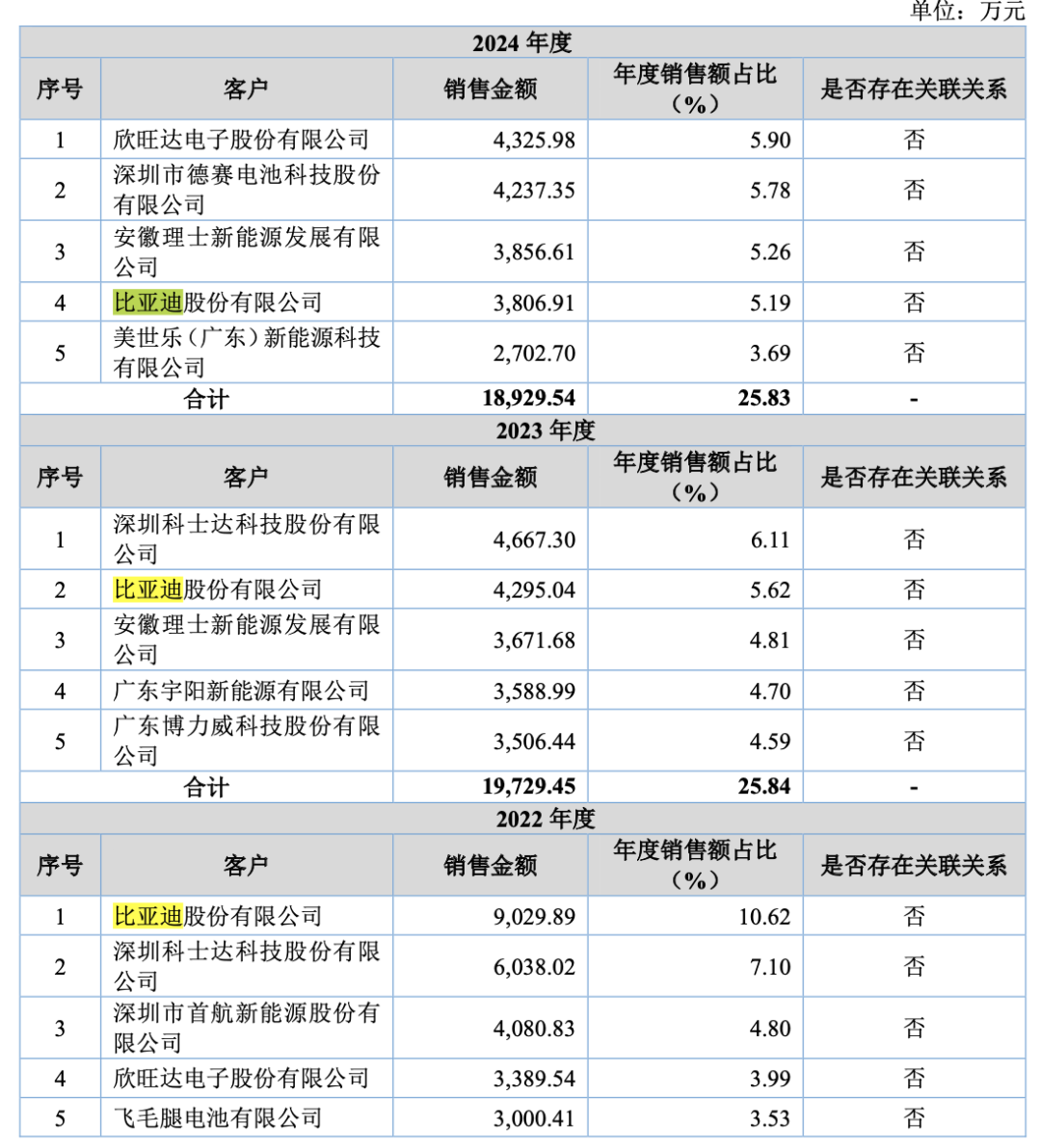 与之对应是 比亚迪 作为大客户的排位下滑。 比亚迪 在2022年时,为公司的第一大客户,2023年降为了第二大客户,2024年降为第四大客户。