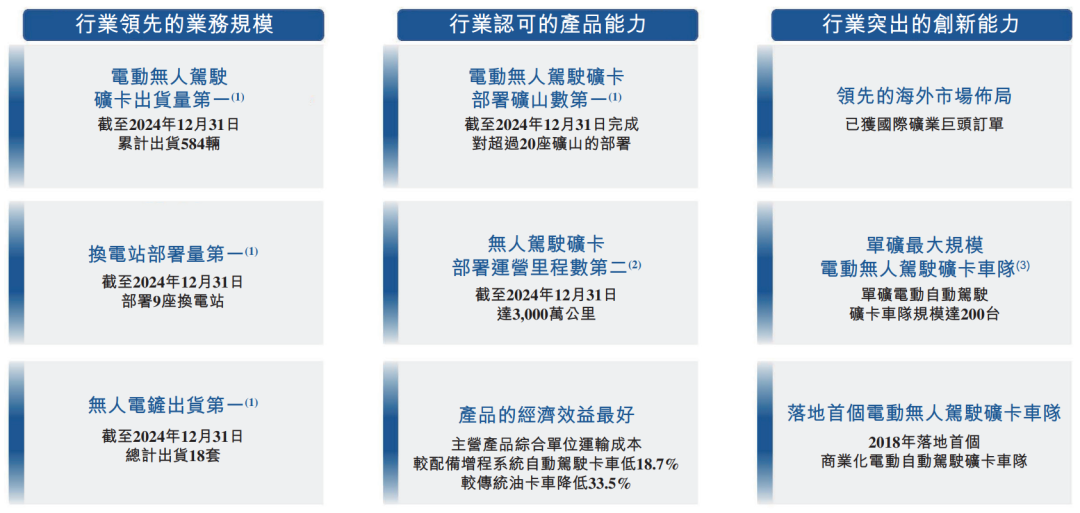 凭借与整车厂商在智能矿车正向设计领域的合作,公司为矿山服务企业、矿主及矿卡原始设备制造商等客户提供伯镭纯电自动驾驶矿卡及解决方案。根据灼识咨询的资料,在自动驾驶矿卡解决方案提供商中,公司是业内唯一拥有自主生产设施的供应商,同时也是充换电一体矿卡的独家提供商。公司率先实现自动驾驶矿卡的量产,公司的旗舰车型也已实现量产。