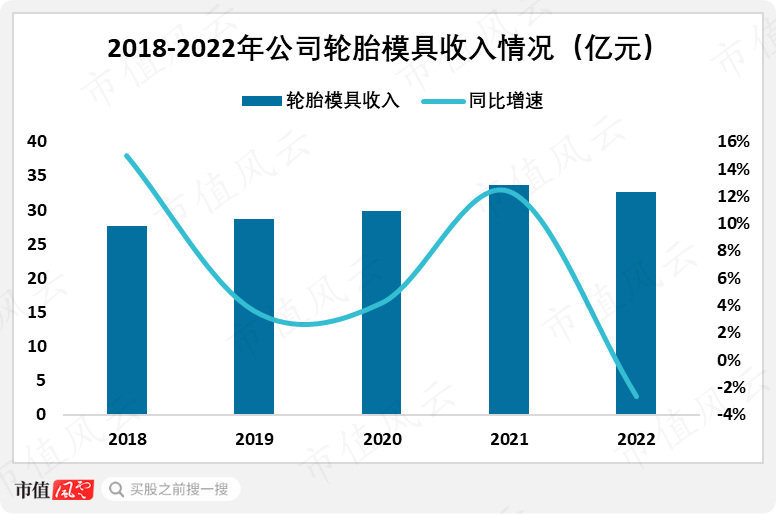2018-2022年,公司的轮胎模具收入由28亿元增至33亿元,CAGR为4%,2022年该业务收入同比转为负增长(-3%),与2018年相比该业务收入同比增速下行趋势明显。