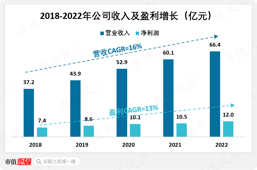 2018-2022年,公司营收由37亿元增至66亿元,CAGR为16%。同期,净利润由7亿元增至12亿元,CAGR为13%。过往五年,公司收入与盈利呈现稳健增长态势。