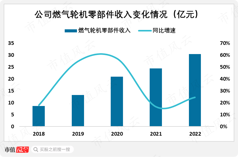 2018-2022年,燃气轮机零部件业务收入由9亿元增至30亿元,CAGR为37%,引领了近年来公司收入端增长。
