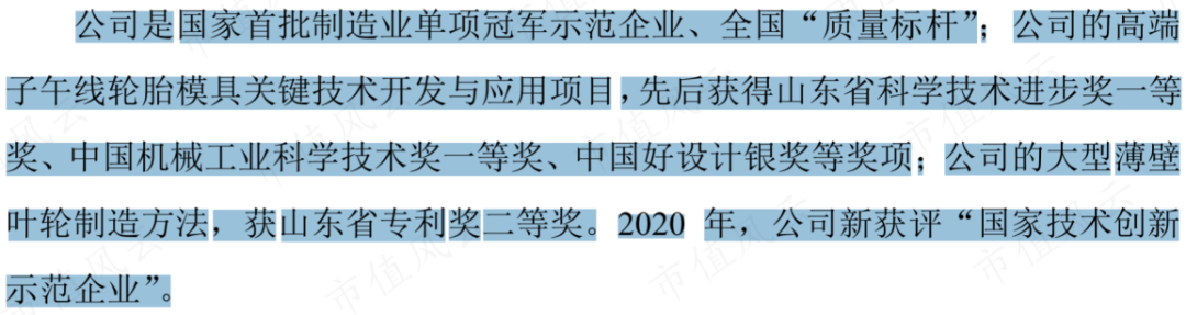 公司的高端子午线轮胎模具关键技术先后获得山东省科学技术进步一等奖、中国机械工业科学技术一等奖等奖项。公司也是国家首批制造业单项冠军示范企业、全国“质量标杆”。