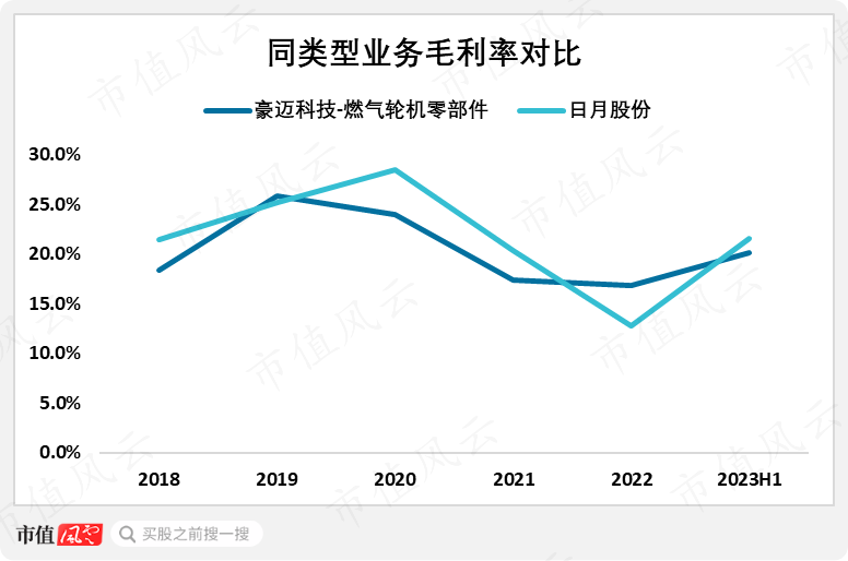 2023H1,受行业回暖影响,公司燃气轮机零部件业务毛利率回升至20%,与同期日月股份毛利率(21.6%)基本处于同一水平线。