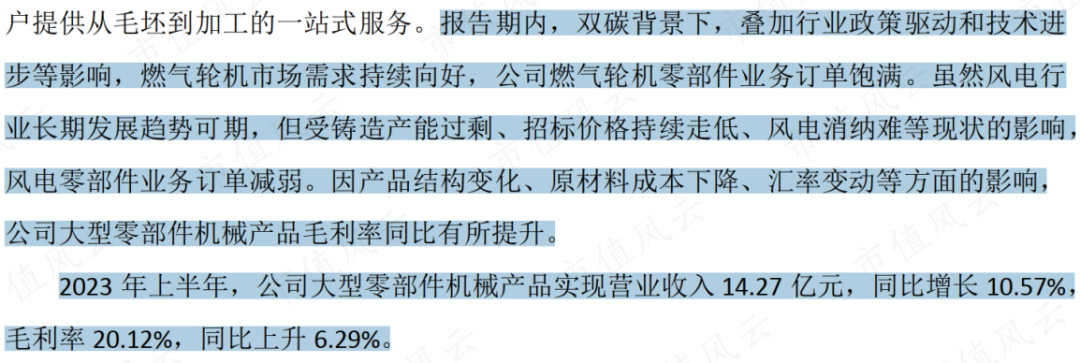 2023H1,公司燃气轮机零部件业务订单饱满,但风电领域受铸造产能过剩、招标价格持续走低等影响,导致公司的风电零部件业务订单减弱,最终,公司燃气轮机零部件业务收入14亿元,同比仅增长11%。